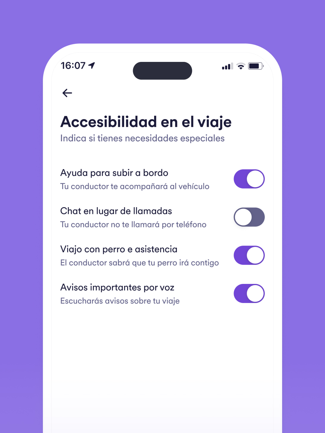 Cuando veas el icono de accesibilidad activo, puedes pulsarlo para conocer las preferencias de las personas que viajan: